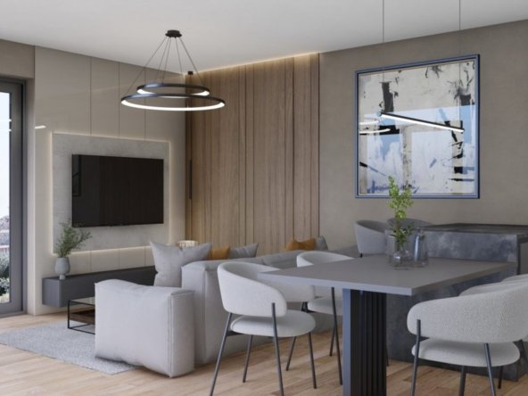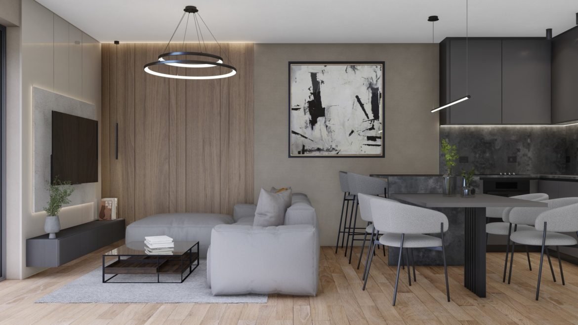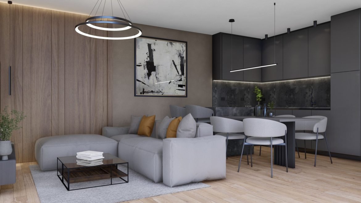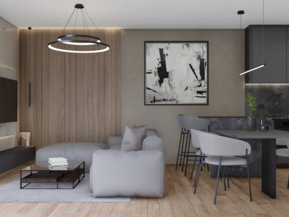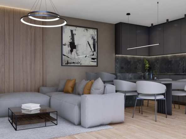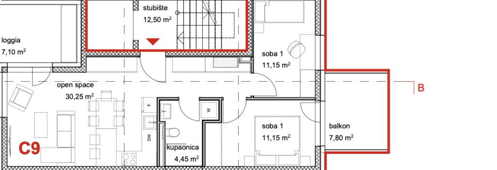 The apartment “C9” is located on the second floor of a residential building. The apartment consists of an entrance hall, open space kitchen, dining room and living room with access to a loggia, 2 bedrooms, one of which has access to a balcony, bathroom and 2 parking spaces which are included in the price.