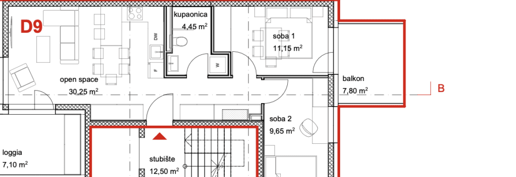 The apartment “D9” is located on the second floor of a residential building. The apartment consists of an entrance hall, open space kitchen, dining room and living room with access to a loggia, 2 bedrooms, one of which has access to a balcony, bathroom and 2 parking spaces which are included in the price.