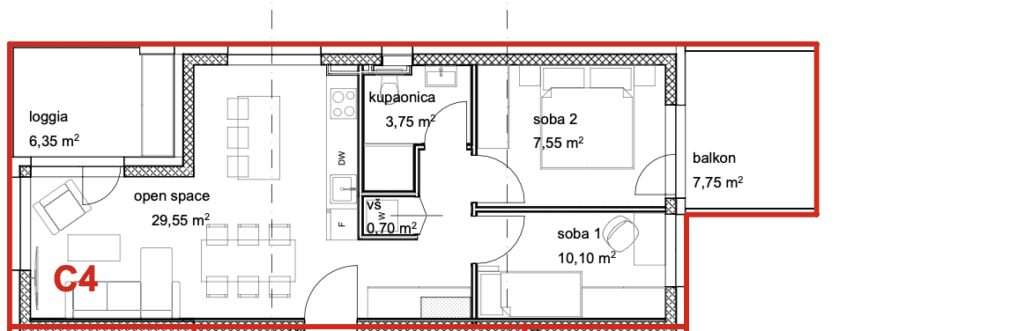 The apartment “C4” is located on the first floor of a residential building. The apartment consists of an entrance hall, open space kitchen, dining room and living room with access to a loggia, 2 bedrooms, one of which has access to a balcony, bathroom and 2 parking spaces which are included in the price.